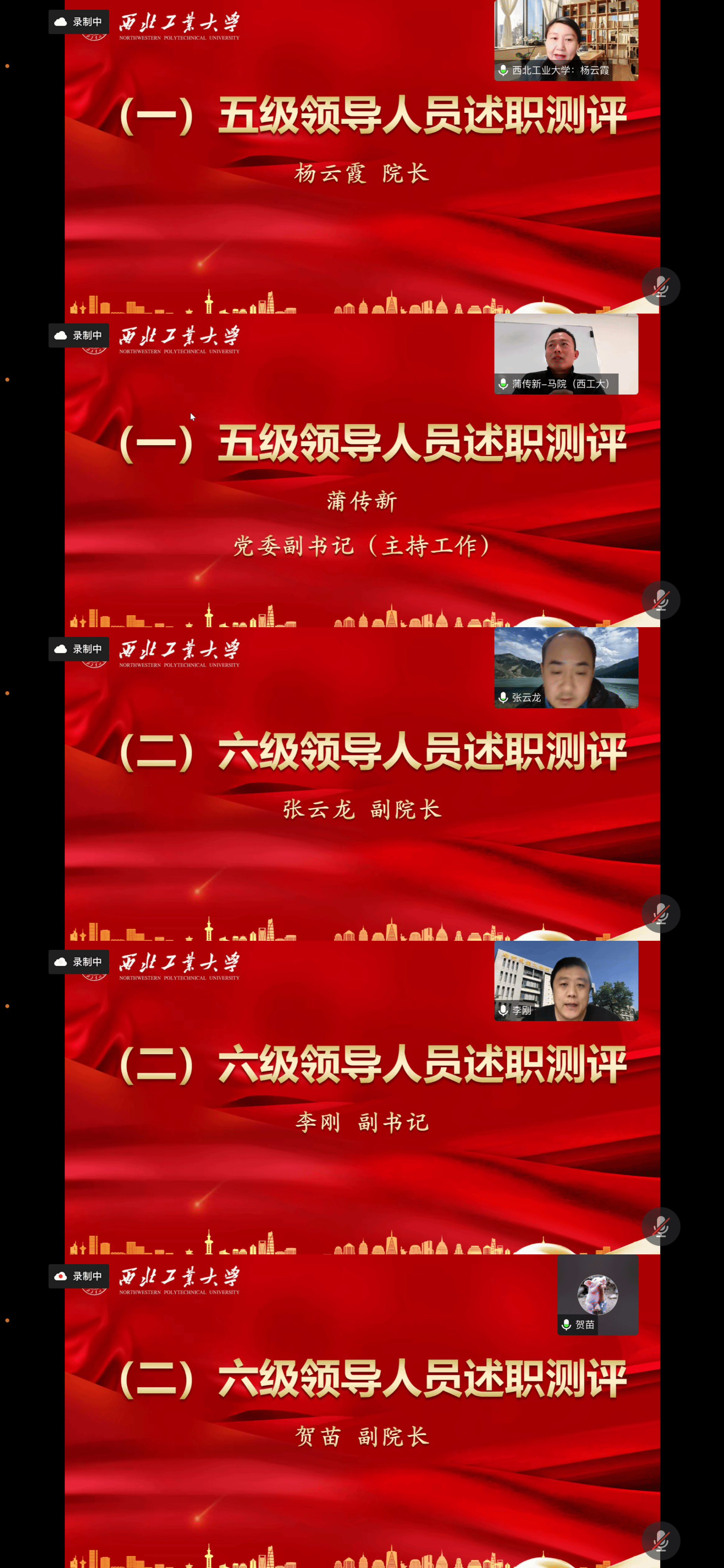 院长杨云霞、党委副书记(主持工作)蒲传新、副院长张云龙、党委副书记李刚、副院长贺苗等五人分别围绕德能勤绩廉方面依次述职,76名教师现场参与测评。