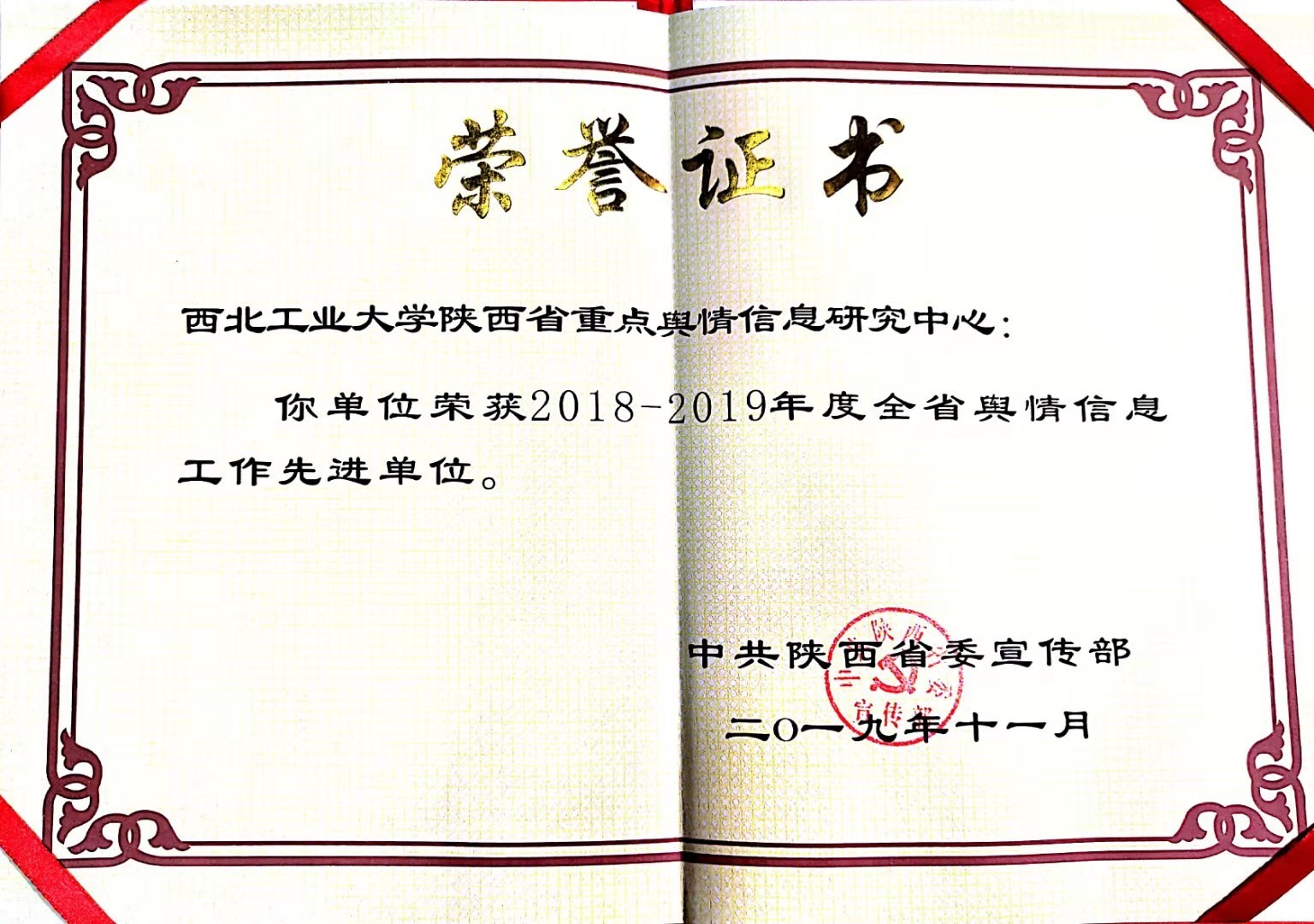 陕西省重点舆情信息研究中心被评为2018-2019年度全省舆情信息工作先进单位、中心副主任贺苗被评为省级先进个人,她撰写的舆情稿件《广东暴雨频发事故拷问城市设施建设》被评为优秀稿件(全省共30篇),并代表中心进行《着力“四个到位”模式 凝聚舆情工作共识》的主题发言。