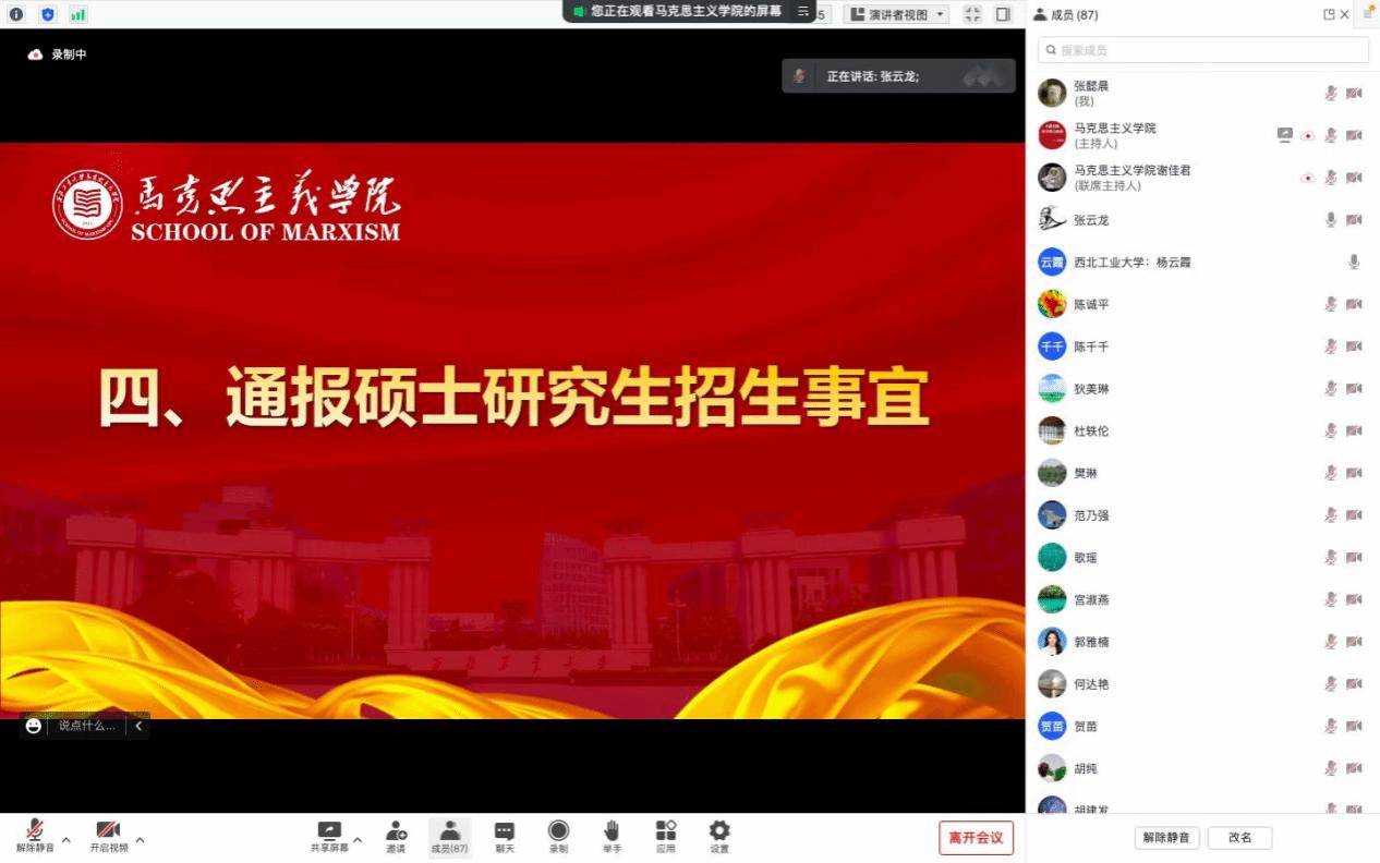 学院副院长张云龙通报了学院硕士研究生招生情况。他表示,学院近几年招生数量、质量均有大幅提升,接下来各位导师要做好双选工作,确保后续工作有序开展。