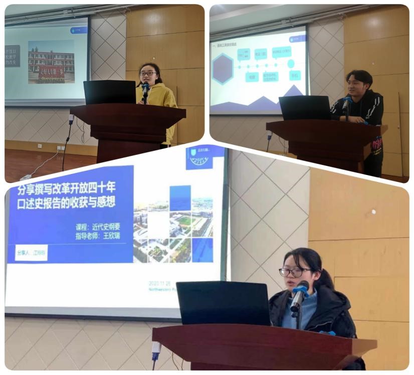 学工部副部长马俊进行大会致辞。其次樊明方教授、赵璐、石培玲教授作为评审专家,分别对获奖学生的口述史进行深入细致的点评和总结。他们认为,同学们的口述史主题鲜明、方法科学、涉及的范围较广。不仅关注衣食住行,而且关注房地产等与人民生活息息相关的方面,采访细致,写作规范。但也同时存在思维方式固化,“非黑即白,非此即彼”倾向。随后,获奖学生代表宋紫寒、江玲玲、张剑科分别通过PPT向大家分享自己改革开放口述史实践的过程、内容及收获。