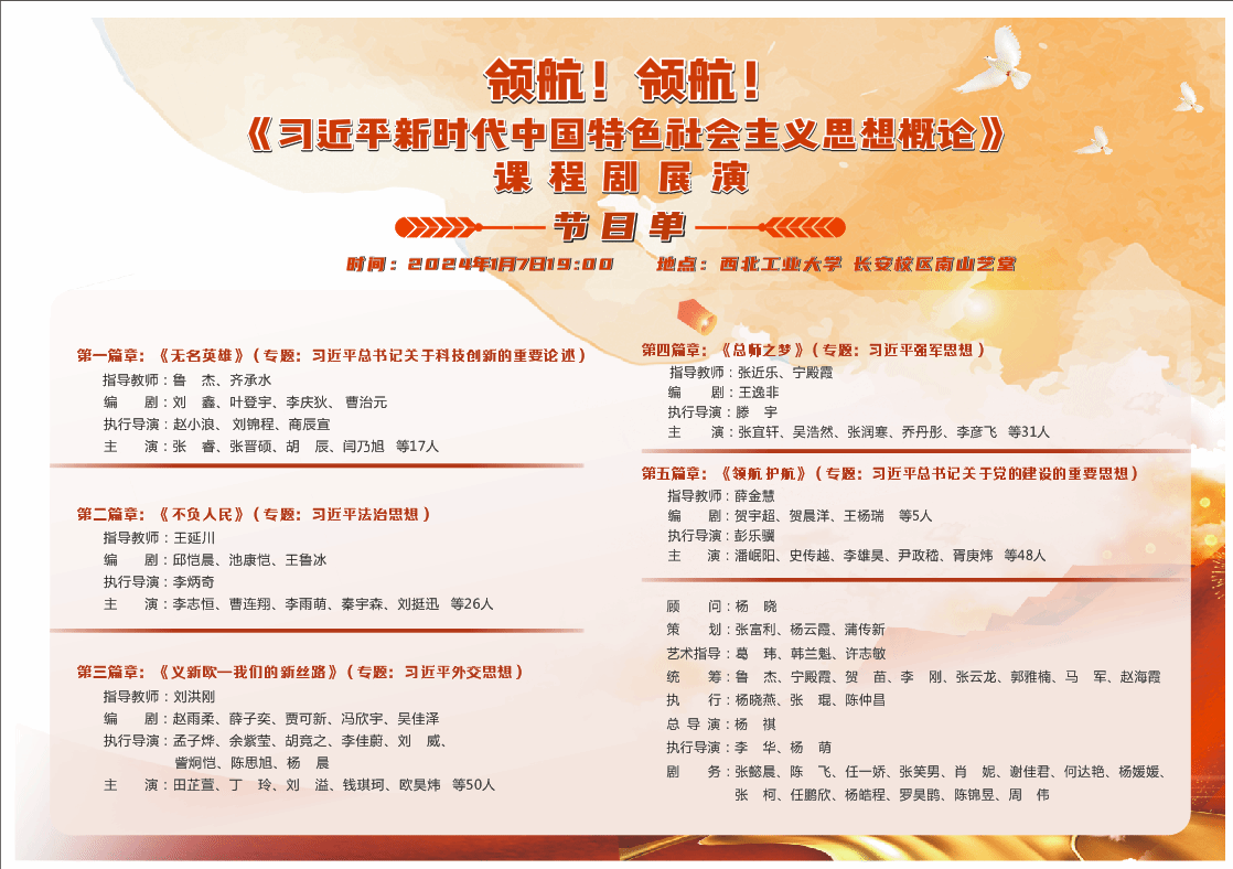 本次展演共5个子剧目,分别根据《概论》课中的“习近平总书记关于科技创新的重要论述、习近平法治思想、习近平外交思想、习近平强军思想、 习近平总书记关于党的建设的重要思想”等5个专题进行创作。国产色情
