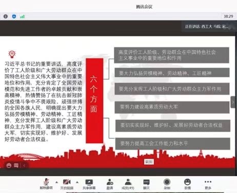 硕士生宋金金则从背景介绍、内容概要、重点解读、问题思考这四个方面进行分析导读,谈到了习近平总书记在讲话中高度评价了工人阶级、劳动群众在中国特色社会主义事业中的重要地位和作用,并且结合了相关具体事例着重说明了新时代要大力弘扬劳模精神、劳动精神、工匠精神。并且阐述了自己的相关问题思考。