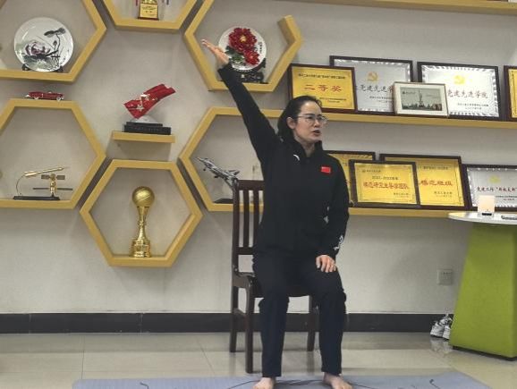 的女工带来了一场健康讲座。彭老师系统为大家讲解和示范了久坐久站缓解疲劳的训练方法,因地制宜利用办公室椅子进行肩背放松修复等训练。