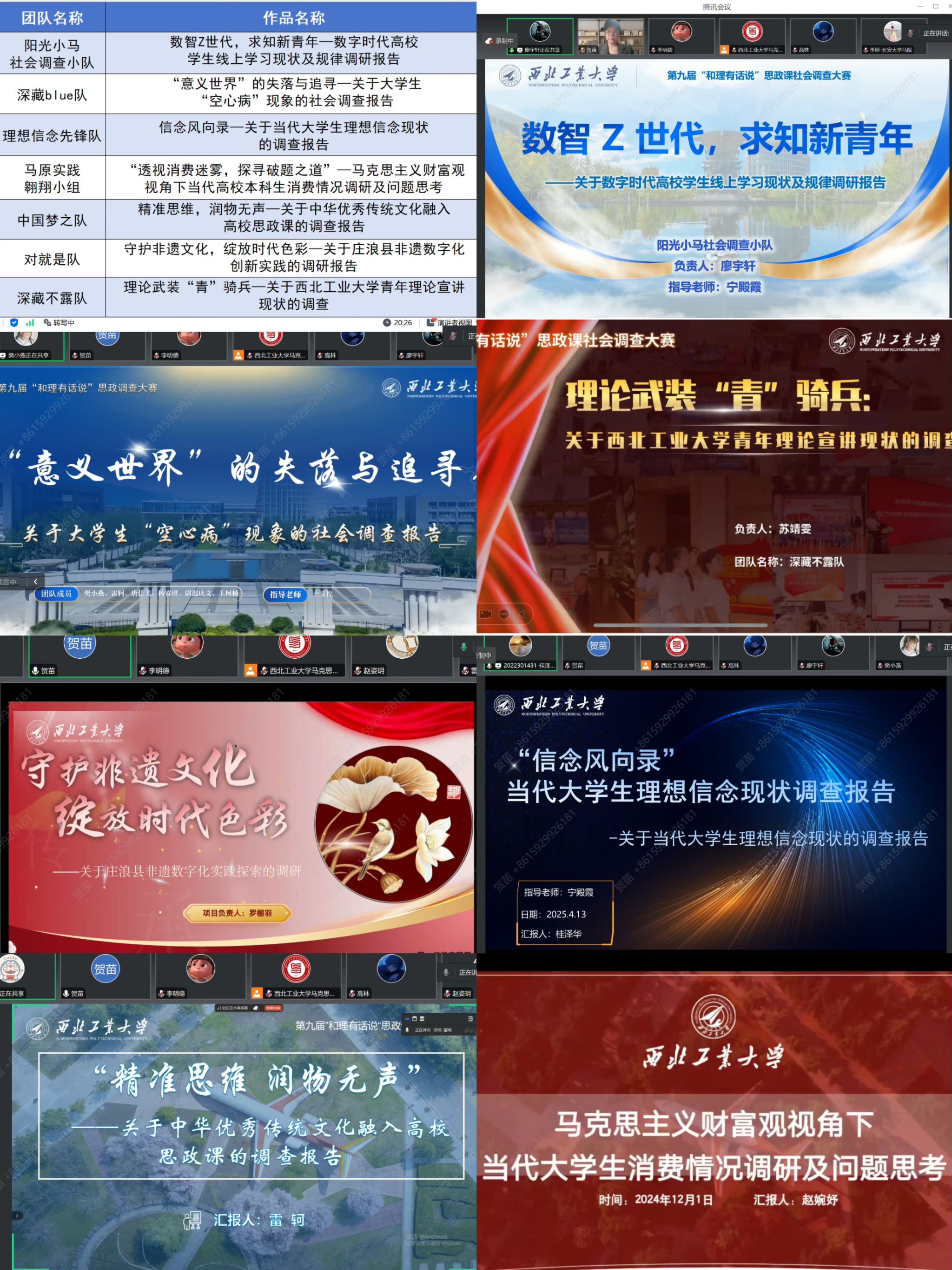 会议开始,贺苗介绍了“和理有话说”思政课社会调查大赛的举办背景。“和理有话说”思政课社会调查大赛作为思政课实践教学的创新举措,是深入贯彻落实习近平新时代中国特色社会主义思想,推动“思政小课堂”融入“社会大课堂”的充分展现。经过初评,在前期全校同学积极参与的基础上,共有18支团队进入终评环节,并择优选择7支团队进行成果展示。各团队负责人依次进行PPT汇报展示,围绕调研背景、调研方法、数据分析、现实意义等方面进行全方位、细致化阐述,主题涵盖线上学习、“空心病”现象、理想信念、非物质文化遗产数字化创新、青年理论宣讲等多个社会热点议题。