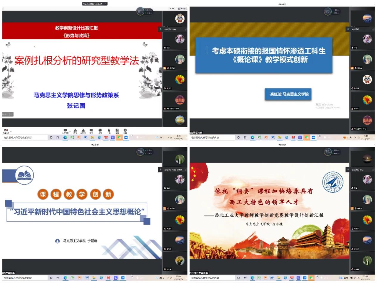 各位参赛老师按照学校教学创新竞赛要求充分准备,从教学内容、教学方法、教学模式等方面对本门课程的教学创新点做了详细介绍说明,更好地体现了学院思政课改革的显著成效。参与点评的思政课教师对参赛者们的竞赛内容表示了肯定,并从自身比赛经验出发,在项目立意、PPT优化、内容结构、语速语态、亲和力展示、新技术运用等方面提出了独到见解。马院副院长贺苗建议各位老师突出成果展示、增强课程质量提升的创新点;马院党委副书记李刚建议明确竞赛内容创新点,突出重点内容,加强表述准确性;蒲瑶教授指出要明确讲课对象,切记以成果汇报方式进行比赛;杨冰郁、薛金慧、柴岳春、折军等几位老师对老师们PPT颜色构图、文字效果、内容措辞等方面提出了修改意见;陈诚平、山磊和温海霞老师建议PPT中增加图片说明,增加创新点和数据支撑等;刘远亮老师建议再凝练题目,进一步突出特色和亮点。