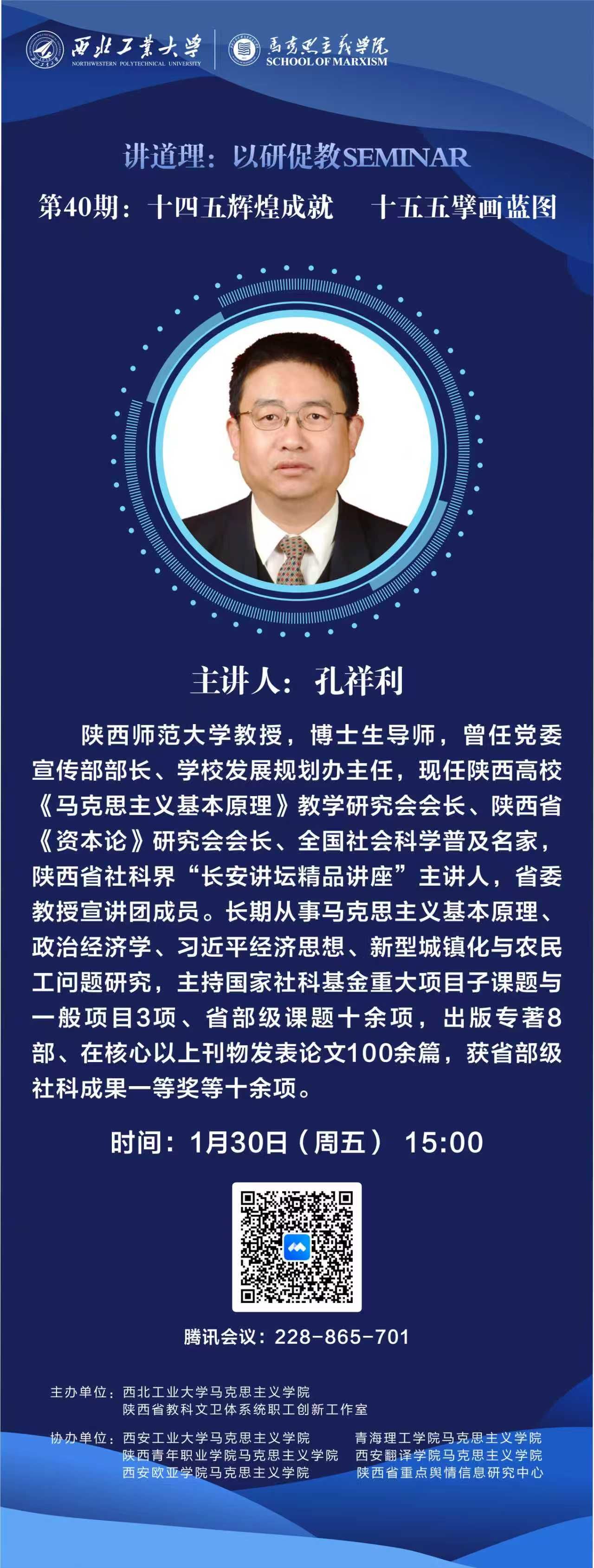 组织了《习近平新时代中国特色社会主义思想概论》备课会暨第40期“讲道理——以研促教Seminar”。本期邀请陕西师范大学孔祥利教授做主题分享,讲座主题为《十四五辉煌成就 十五五擘画蓝图》。