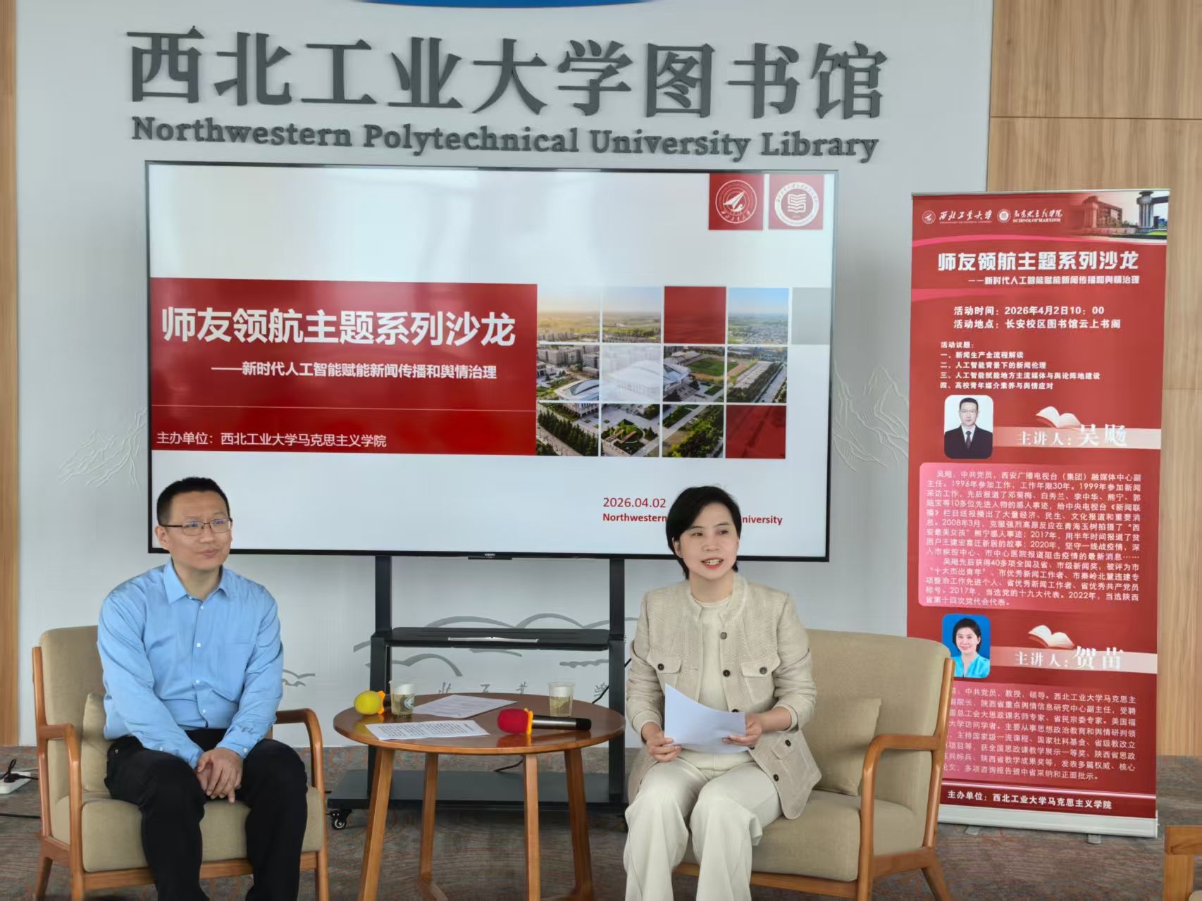 持续深化师生交流,助力学子成长,推进“大思政课”立德树人实效,创新开展师友领航主题系列沙龙。4月2日,特邀西安广播电视台(集团)融媒体中心副主任吴飏,聚焦融媒时代新闻宣传工作发展与舆情生态变革,为师生带来前沿分享与深度探讨。本次沙龙在长安校区云上书阁进行,国产色情