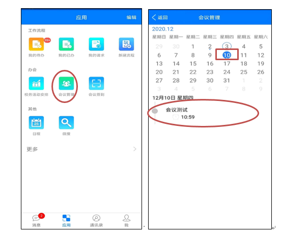 STEP1: 查看会议室使用情况:登录E-Mobile,在“应用”-“会议管理”-“会议室占用情况”查看。