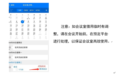 STEP3:取消会议室预定:在“会议”—“会议室使用情况”—点击本人预定信息右侧图标“取消”。