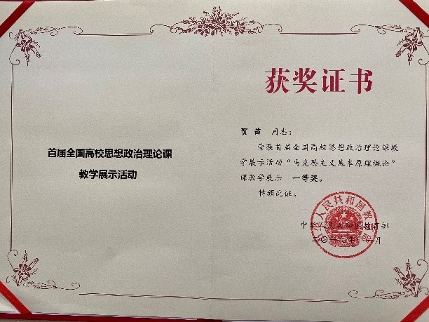A few days ago, the certificate of “the first teaching exhibition activity for ideological and political theory course in national colleges and universities” was issued by the Ministry of Education. The good news was that two teachers of School of Marxism have got this honor, with He Miao and Pu Yao winning the first prize and the second prize respectively. This is another great achievement that School of Marxism has made in the national teaching activities for ideological and political theory course.
