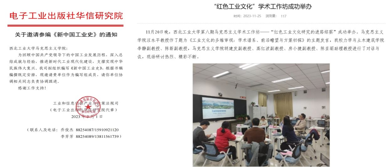 3.积极深化“红色工业文化”研究。2023年初,汪永平成立“红色工业文化研究”团队,团队成员来自国产色情 、机电学院和力学与土木学院。团队成立后,受邀参与完成了工业和信息化部政策和法规司委托项目《新中国工业史》的编撰;获批了国产色情 “双一流学科建设”项目“研究生高水平教材”系列之“中国工业精神谱系”课题;开展工业文化研究工作坊;指导研究生撰写毕业论文“中国式现代化视野里中国工匠精神的演进历程:以劳动模范为切入点”和“十七年工业歌谣的文化精神建构研究”。