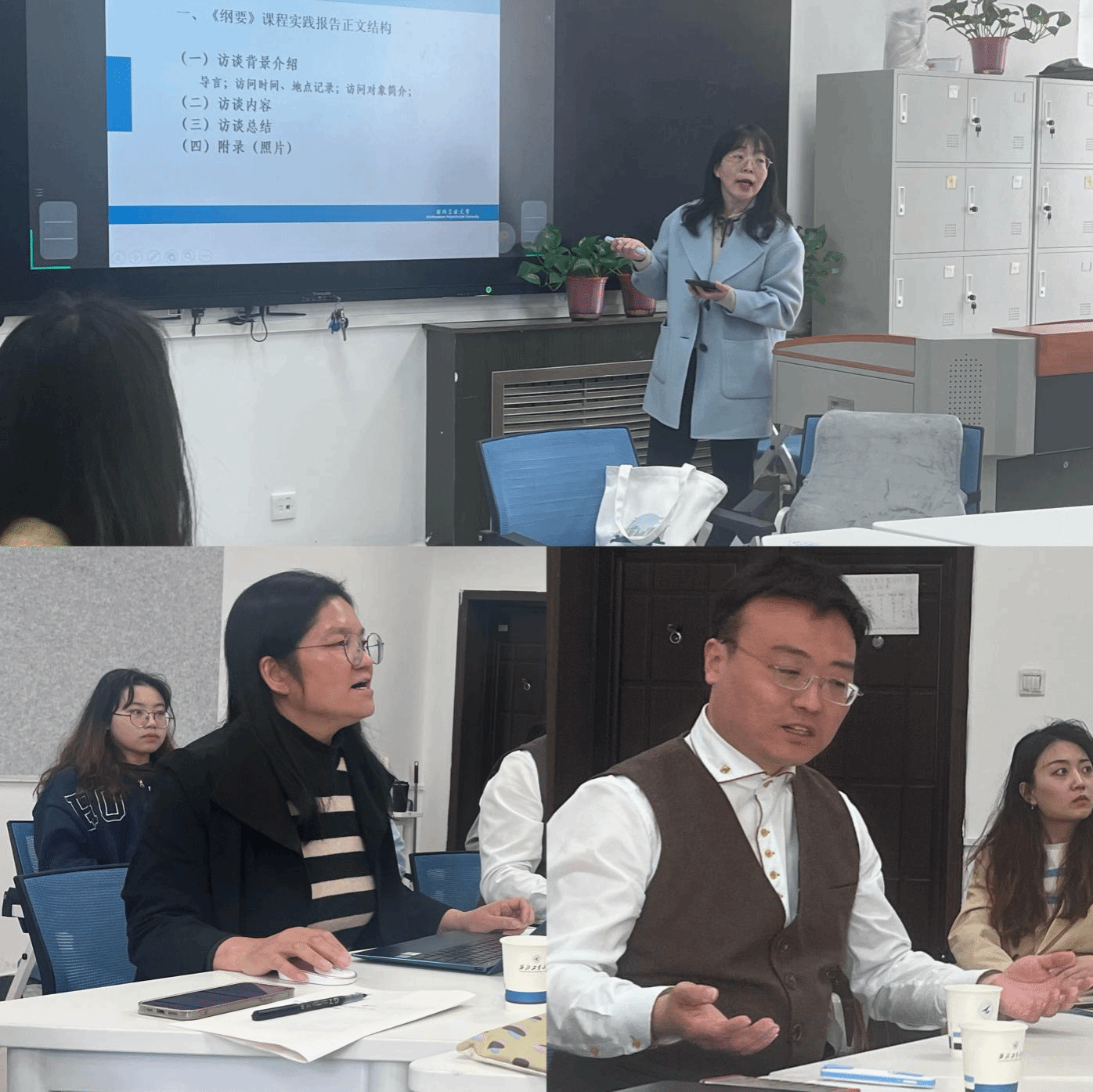 口述史开展现状以及带队调研袁家村、周至水街、东韩村的经历进行了生动细致地介绍,指出口述史活动走入思政课堂,提升了学生的政治认同感,增强了合作精神和实践能力。王欣瑞副教授就口述史调研报告正文结构、问题设计技巧及学生实践报告常见问题进行了深入的分析。她指出口述史区别于其他的学术总结报告的关键特征在于口述史所体现的独特的个体经验,通过细节描摹,使叙事更加生动真实。因此,王老师格外强调附录照片在口述史报告册中的重要性,指出照片本身就是对历史的一种真实记录。房小捷副教授在对以上两位老师进行补充发言的同时,对西安以及国产色情