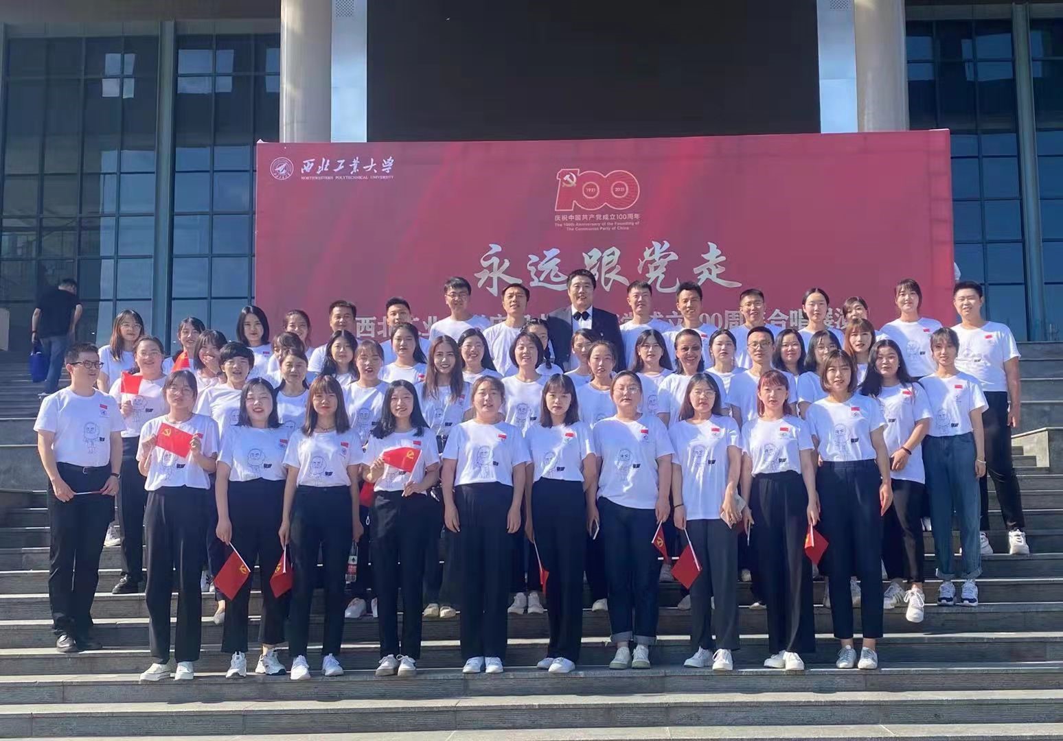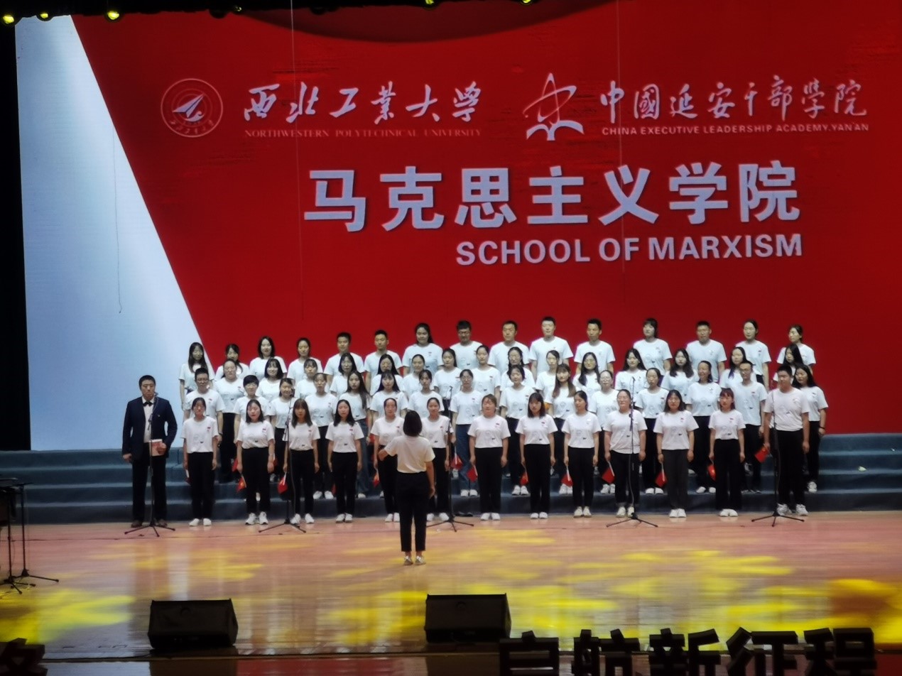 党委领衔,近百名学院师生组成合唱团,统一身着定制文化衫,手拿党旗,歌唱祖国《走向复兴》。在歌声响起前,学院还特别设计了朗诵《共产党宣言》的环节,以此来铭记共产党人的初心。
