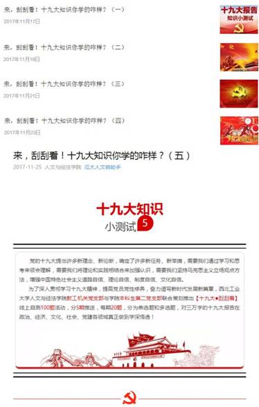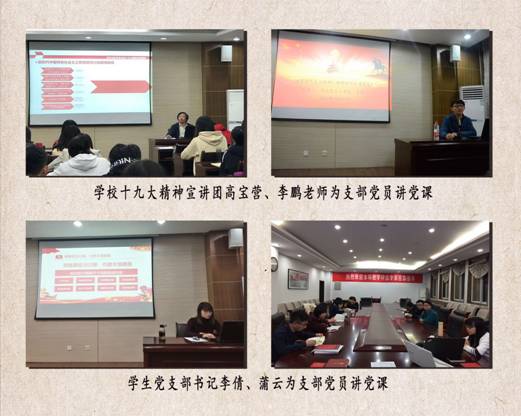 党委共有学生党员共146人,其中正式党员114人;从本科到硕士、博士,采取纵横结合的方式共成立12个学生党支部。在党的十九大精神传达学习工作中,学工组首先按照校党委的部署和学院的要求,分全体学生和学生党员两个层面开展学习,通过年级、班级、党支部、团支部、学生会等五种载体,开展全院学生集体学习和宣讲3场,各年级学习研讨6次,专题学习班会24次,党支部专题学习会和支部书记讲党课12场次,学院教师到入党积极分子、预备党员培训班进行党课送讲4场。学院领导班子成员、思政课教师、研究生导师、辅导员、班主任等多管齐下、当好表率,带领学生一起学、指导学生深入学、督促学生扎实学,实现了线下学习的全员覆盖和多重覆盖。同时,学院微信平台除常态化推送党的十九大精神学习材料、辅导报告等内容外,还专门开辟“周末党员之声”栏目,分享学生党员学原著的动态和悟原理的体会。近期,学生党员又自主开发了“学习答题刮刮看”栏目,分5期推出了党的十九大精神100题,为学生党员利用碎片化时间开展理论学习提供支撑。