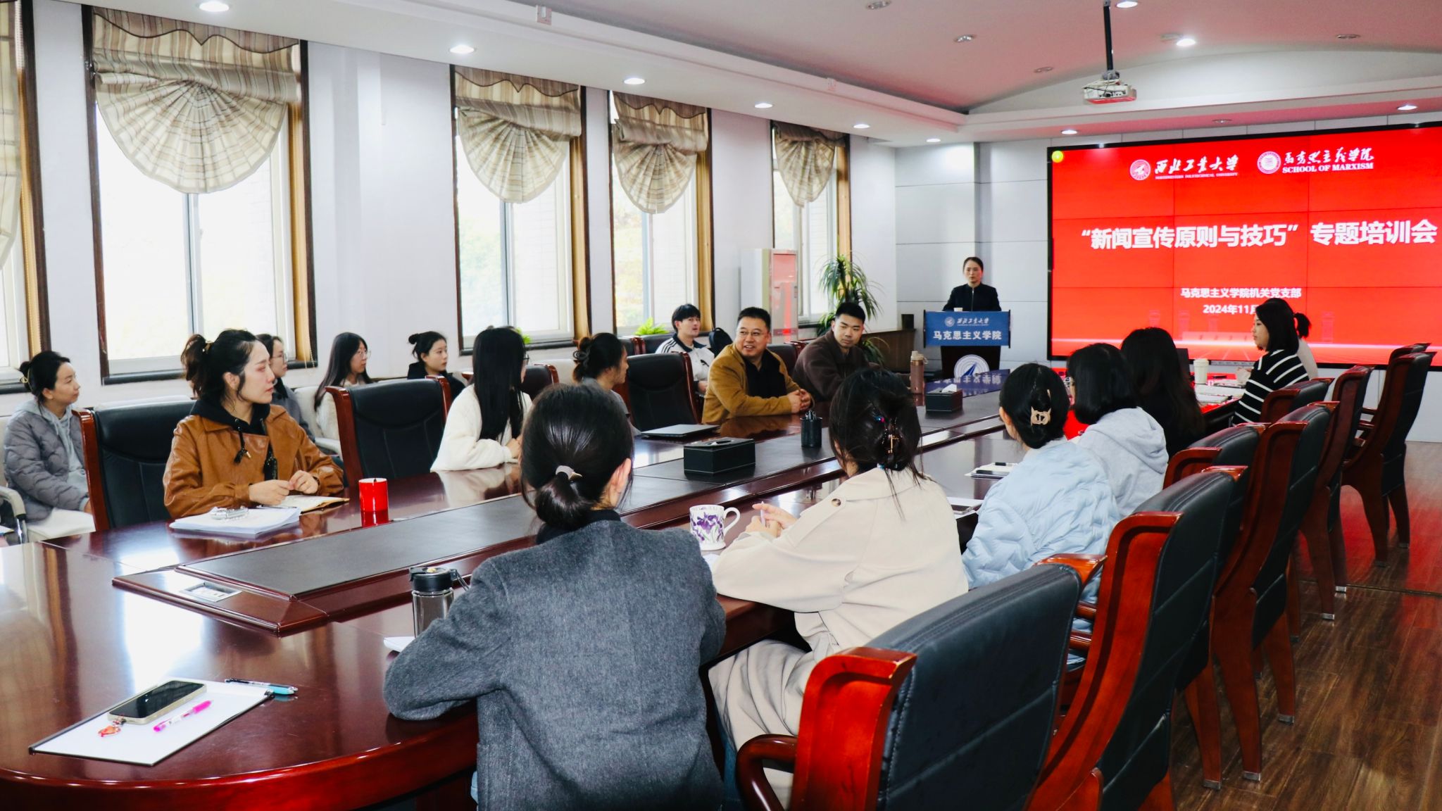 机关党支部开展新闻宣传专项工作培训会。培训会邀请校党委宣传部融媒体中心付怡作为主讲嘉宾。本次培训会吸引了学院机关党支部全体成员、辅导员以及来自各兄弟学院的师生等40余人参与。会上,与会师生积极互动,认真倾听并记录重点,气氛热烈。会议由学院党委书记王彦革同志主持。