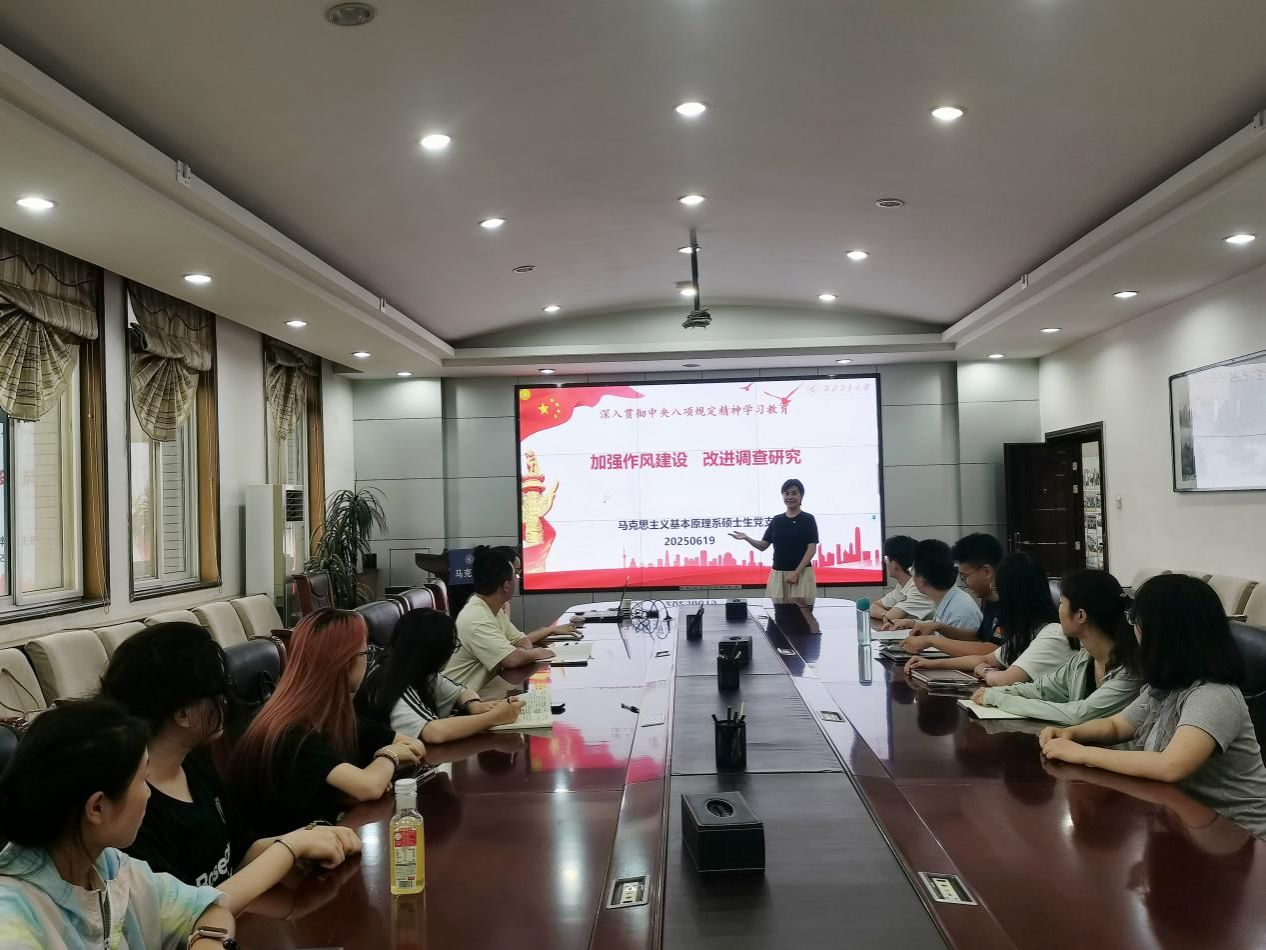 为深入贯彻中央八项规定精神学习教育,强化学生党员纪律意识与作风建设,切实推动党规党纪学习教育入脑入心,学院副院长贺苗于2025年6月19日在208会议室为马克思主义基本原理系硕士生党支部讲授“加强作风建设 改进调查研究”专题党课。