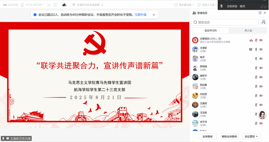 为深入学习贯彻习近平总书记关于青年工作的重要思想,筑牢理想信念根基,2025年8月21日10时,“‘青’音传思想伟力・‘马’力助奋进征程”暑期社会实践队携手青马先锋学生宣讲团,与航海学院学生第二十三党支部联合开展专题联学宣讲活动,共话新时代青年使命担当,凝聚奋进力量。