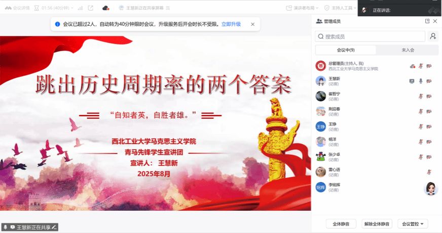 宣讲环节中,实践队成员王慧新同学以“跳出历史周期率的两个答案”为主题,围绕“历史周期率的深刻内涵”“跳出历史周期率的第一个答案——人民监督”“跳出历史周期率的第二个答案——自我革命”“新时代青年如何永葆自我革命精神”四个方面展开理论宣讲。她结合党的百年奋斗历程与新时代改革发展实践,深刻阐释自我革命对于党永葆生机活力的重要意义,勉励在场青年学生要始终保持自我革命的勇气与决心,在理论学习中坚定理想信念,在实践锻炼中提升能力素质,以青春之力扛起时代重任。