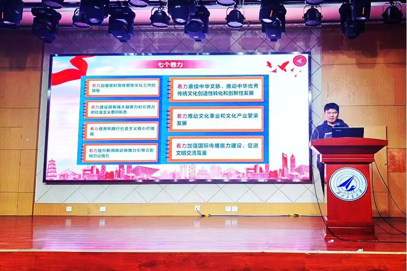 会议伊始,主持人王枫从理论层面、实践层面和现实层面为大家解读了习近平文化思想的基本内涵和重要意义,表示作为新时代青年,必须把做到“两个维护”作为首要政治任务,坚持不懈用习近平新时代中国特色社会主义思想凝心铸魂,树立文化自信、开放包容、守正创新的理念,用青春奋斗助力中国式现代化。
