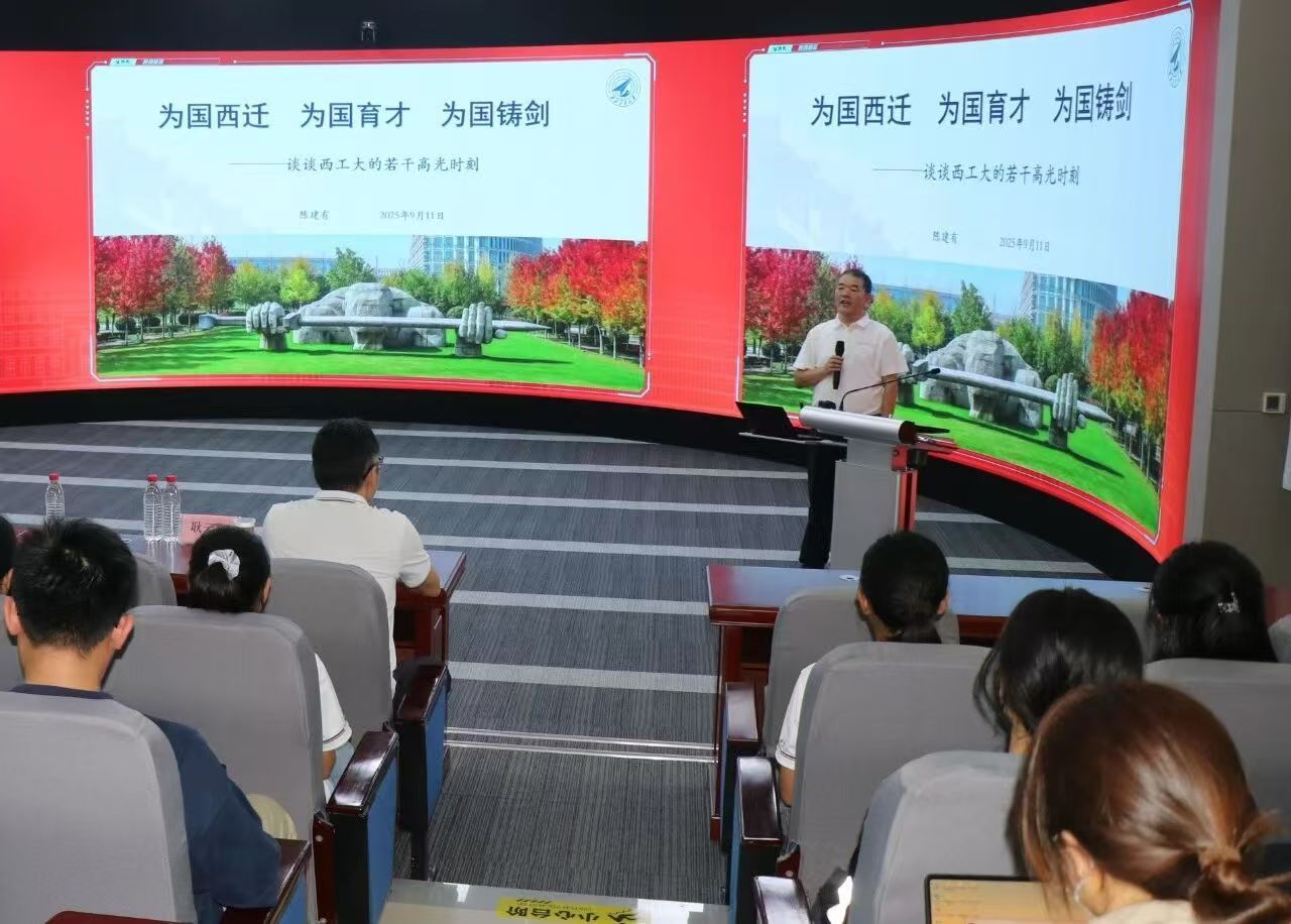校务委员会副主任、原校党委副书记陈建有在学院楼207报告厅以《为国西迁、为国育才、为国铸剑——谈谈西工大若干高光时刻》为题讲授校史校情课,学院党委副书记耿云辉主持,全体学工成员与2025级本硕博新生、党员发展对象等同学共同聆听。
