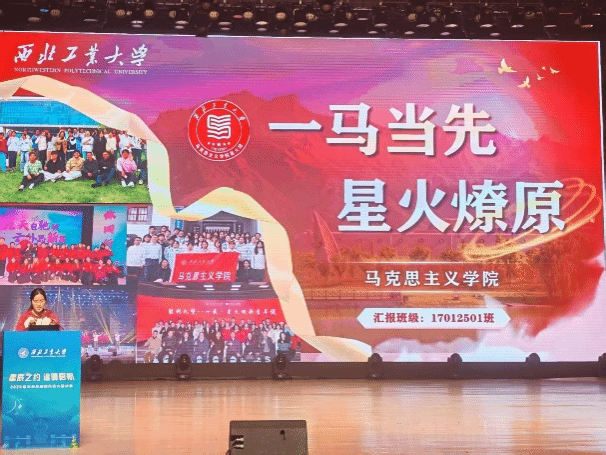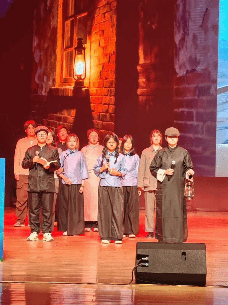 班级的展演节目匠心独运,以“情景剧+合唱”的融合形式深情呈现。当1938年古路坝的麻油灯火遇上2025年西工大图书馆的灯光,一段跨越近百年的星火传承故事徐徐展开。舞台之上,时空交错:一侧是烽火岁月里,西北工学院学子们在简陋学舍中抱书苦读,以“读好书救中国”的信念坚守初心;另一侧是新时代校园中,国产色情