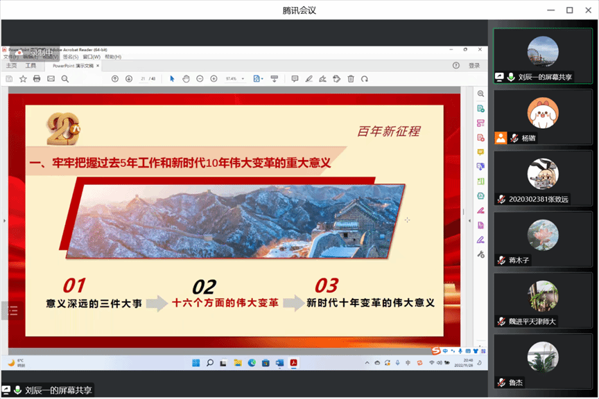 博士生刘辰一同学进行导读。内容共分为四个部分进行阐释。第一部分,刘辰一同学指出党的二十大报告是一篇中国当代马克思主义的光辉文献,是全面推进中华民族伟大复兴的行动纲领,要深入学习贯彻领会党的二十大精神。第二部分介绍了党的二十大报告的主题。第三部分,具体阐释了五个“牢牢把握”,凝炼了党的二十大的精神内涵。第四部分呼吁广大青年争做有理想、敢担当、能吃苦、肯奋斗的新时代青年,让青春在全面建设社会主义现代化国家的火热实践中绽放绚丽之花。