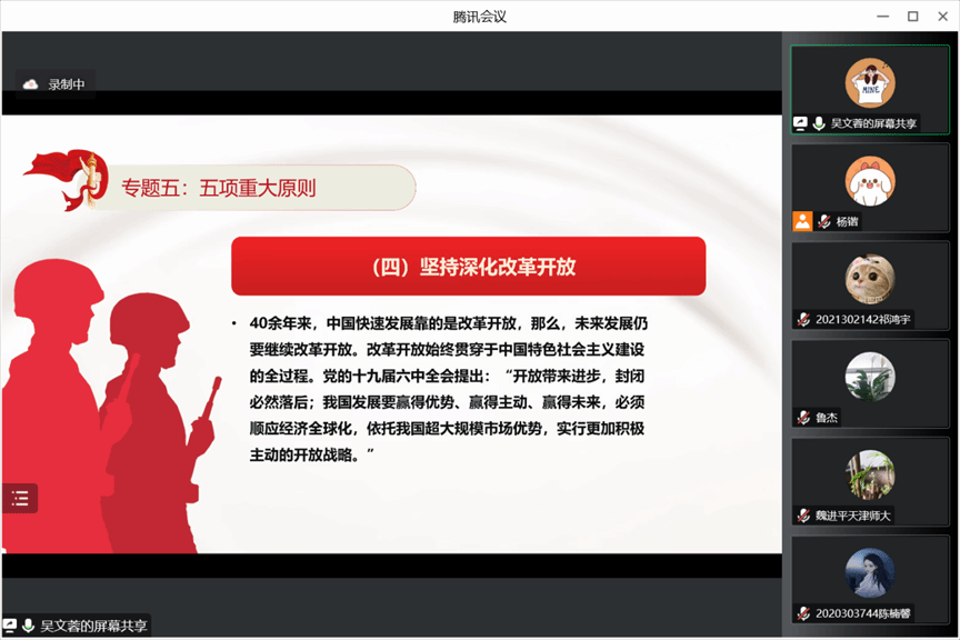 硕士生吴文蓉同学。她从一个现代化、第二个答案、三大要素、四个自信、五项重大原则五个专题展开。首先是一个现代化。吴文蓉同学从多维度介绍了中国式现代化的内容,指出中国的发展不是通过剥削他国,而是通过发展自己实现现代化,与西方现代化有本质区别。在第二个答案专题中,强调自我革命是党跳出治乱兴衰历史周期率的第二个答案,自我革命是党永葆生机活力的强大支撑、是党站稳人民立场的集中彰显、是党引领社会革命的重要保障。第三个专题是三大要素。从科教兴国、人才强国、创新驱动发展战略入手,强调教育、科技、人才是全面建设社会主义现代化国家的基础性、战略性支撑。第四个专题是四个自信。吴文蓉同学指出坚定道路自信,为人类探索更好社会制度提供实践途径;坚定理论自信,为人类探索更好社会制度提供科学指南;坚定制度自信,为人类探索更好社会制度提供参考借鉴;坚定文化自信,为人类探索更好社会制度提供中国智慧。最后一个专题是五项基本原则,即坚持和加强党的全面领导、坚持中国特色社会主义道路、坚持以人民为中心的发展思想、坚持深化改革开放和坚持发扬斗争精神,鼓励当代青年在勤学敏思中不断增长才干,在社会实践中不断磨砺自我,在肩负时代重任中行胜于言,在真刀真枪的实干中成就一番事业。
