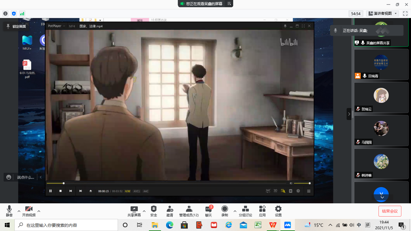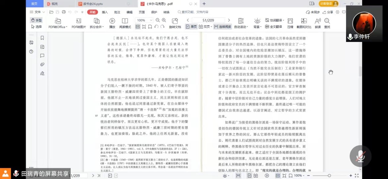首先,硕士生李仲轩、贺瑞云、韩诗唯等先后阅读书中内容,并表达了自己对于内容的看法,还提出了一些有代表性的问题。在阅读过程中,老师与同学着重探讨了以下几个问题:第一,如何理解“现实的就是合理的,合理的就是现实的”?吴鑫老师认为,不能仅凭对词语的理解去解释这句话,合理不是日常生活中常用的那个概念,而是合乎理性的意思,这句话是黑格尔思想体系中经典的论断,其中蕴含着西方形而上学的传统。杨永强老师也强调不能简单解读这句话,“合乎理性”更加贴切原意,也更加生动。第二,青年黑格尔派和老年黑格尔派的对立。吴鑫老师认为,这两派的产生都是因为片面理解黑格尔思想而产生的,老年黑格尔派偏向保守,宣称只有现实的才是合理的,青年黑格尔是激进的,认为只有理性的才是现实的。杨永强老师则从生产力和生产关系的角度去理解两派的差别,认为两派只是拿着黑格尔的话来论证自身行为的合理性,已经脱离了黑格尔原本的意思。第三,思想上的革命是否会引起行动中的革命。吴鑫老师提出,自上而下的革命是存在的,但是仅仅依靠思想革命是不现实的。此外,吴鑫老师还结合动漫《领风者》进行解读,让大家深入理解马克思的早年经历。