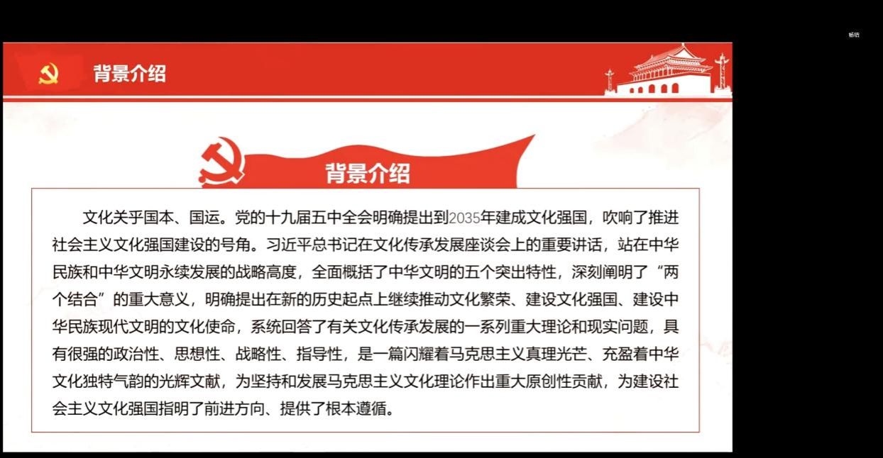 硕士生杨锴同学。她将导读内容分为四部分进行阐释。第一部分是讲述了这一重要讲话的背景内容,习近平总书记明确提出在新的历史起点上继续推动文化繁荣、建设文化强国、建设中华民族现代文明的文化使命,系统回答了有关文化传承发展的一系列重大理论和现实问题。第二部分是对文本内容从三个方面进行了全方位多维度的解释。第三部分是对“第二个结合”的重点解读。第四部分重点介绍中华民族现代文明的内涵研究、意义研究、建设路径研究以及“第二个结合”视域下中华民族现代文明研究。