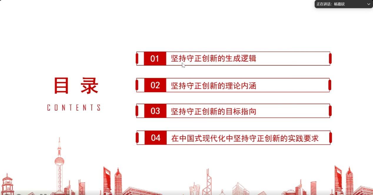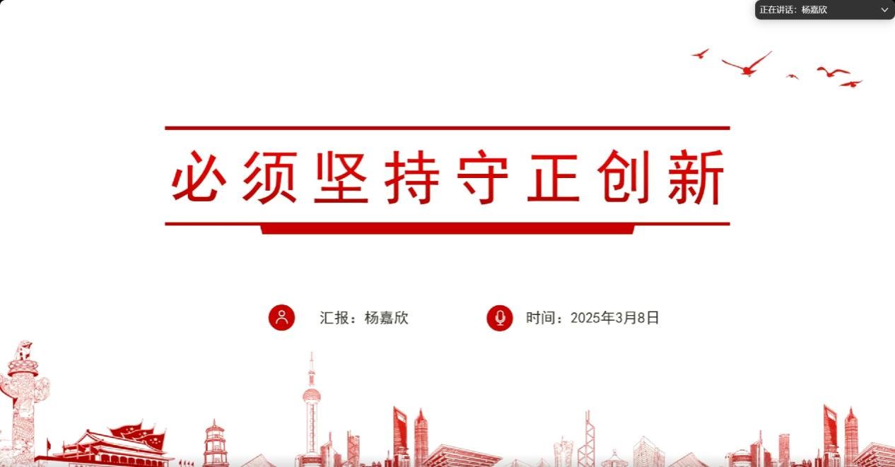 接着,硕士生杨嘉欣同学从生成逻辑、理论内涵、目标指向和实践要求四个方面进行了深入解读。她强调“守正创新”蕴含着丰富的理论内涵,这一理念不仅是对过往优秀传统的继承与发扬,更是对未来发展路径的积极探索与勇敢开拓。