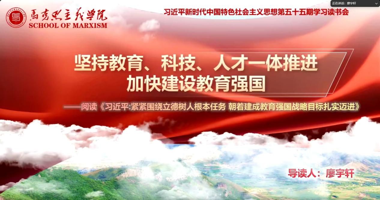硕士生廖宇轩同学作为首位导读人,在认真学习研读《习近平:紧紧围绕立德树人根本任务 朝着建成教育强国战略目标扎实迈进》文本内容的基础上,以坚持教育、科技、人才一体推进加快建设教育强国为主题进行分享。首先,他通过对习近平总书记关于教育论述的梳理,全面系统阐释了为什么要坚持教育、科技、人才一体推进;其次,他结合国产色情