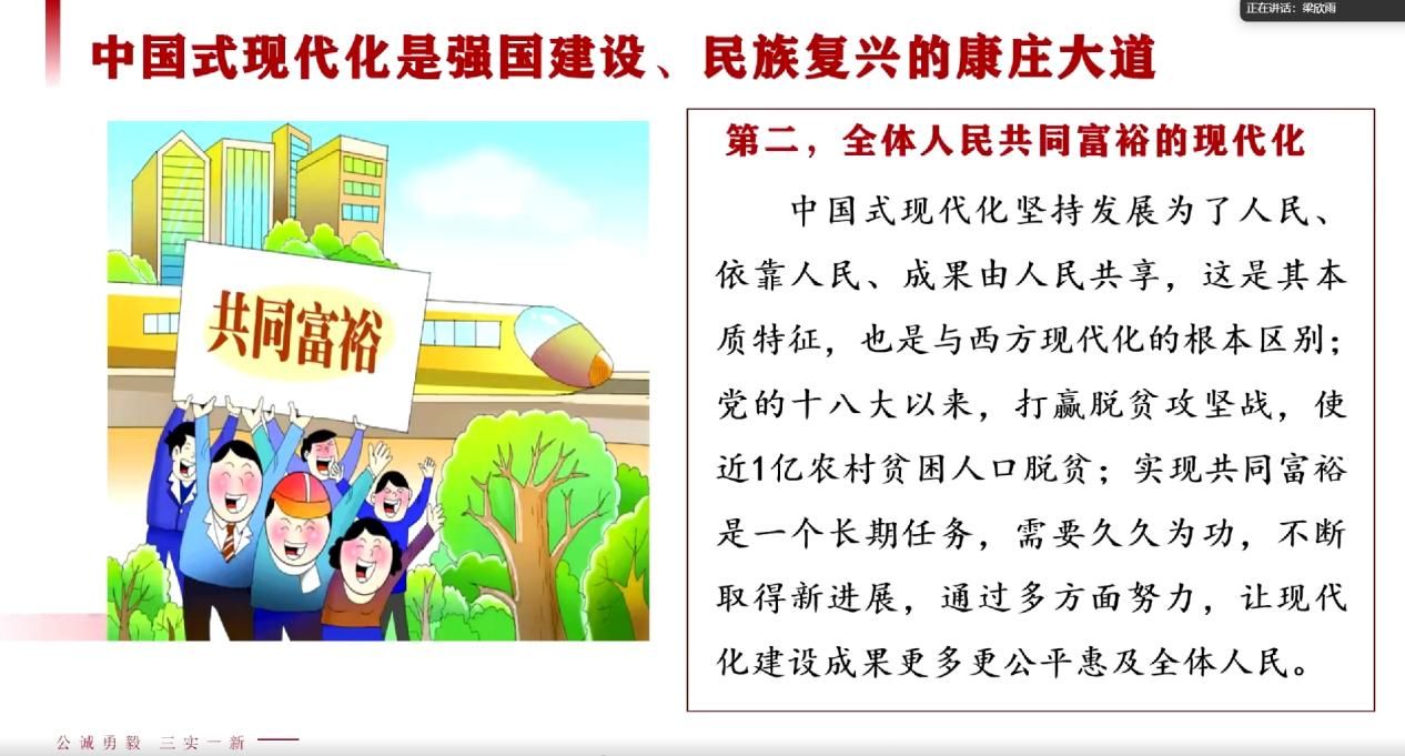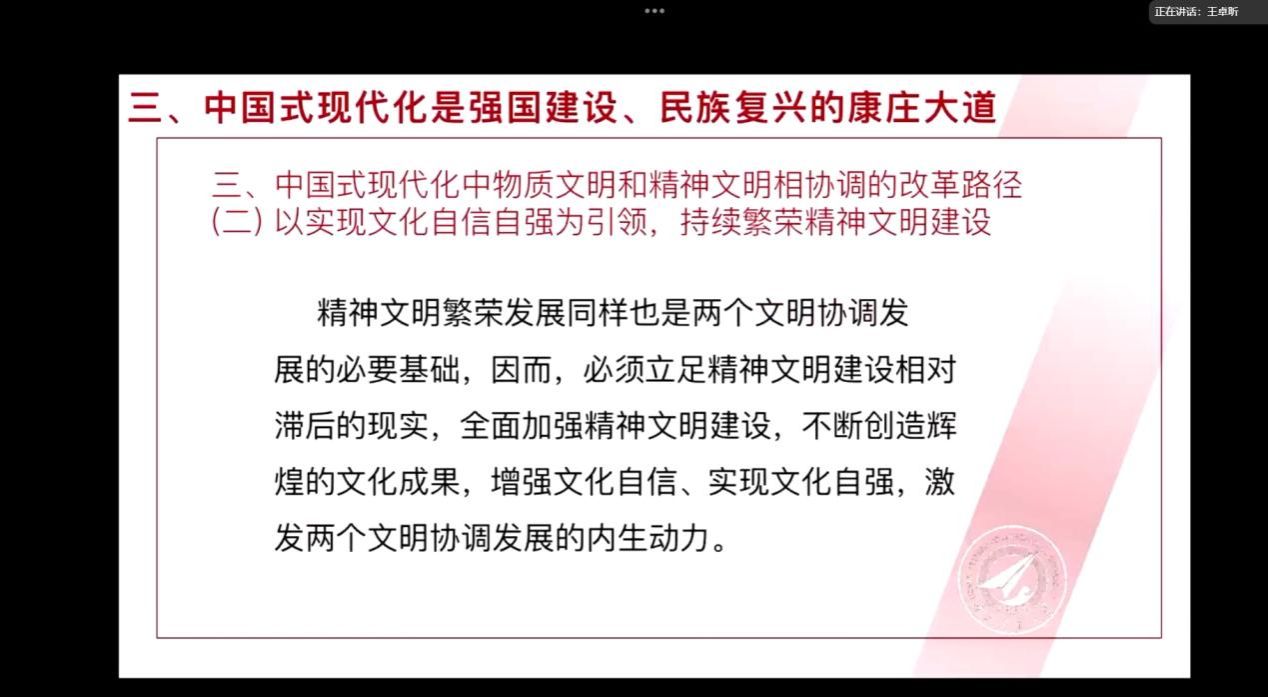 硕士生王卓昕同学作为首位导读人,在认真研读《以中国式现代化全面推进强国建设、民族复兴伟业》文本内容的基础上,围绕中国式现代化是强国建设、民族复兴的康庄大道这一点,通过文献资料收集整理,把相关的一些观点进行了系统梳理,内容丰富、逻辑清晰,与大家进行了学习分享。推进中国式现代化是一个长期的任务,还有许多东西需要认识深化,要不断加强理论研究和实践探索。