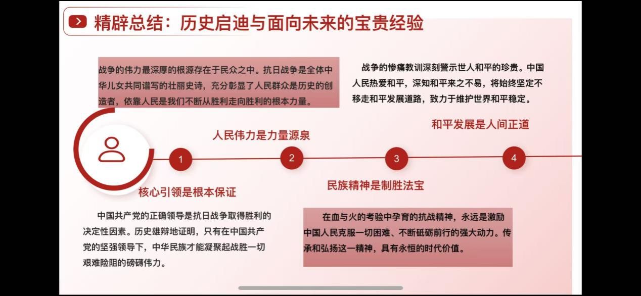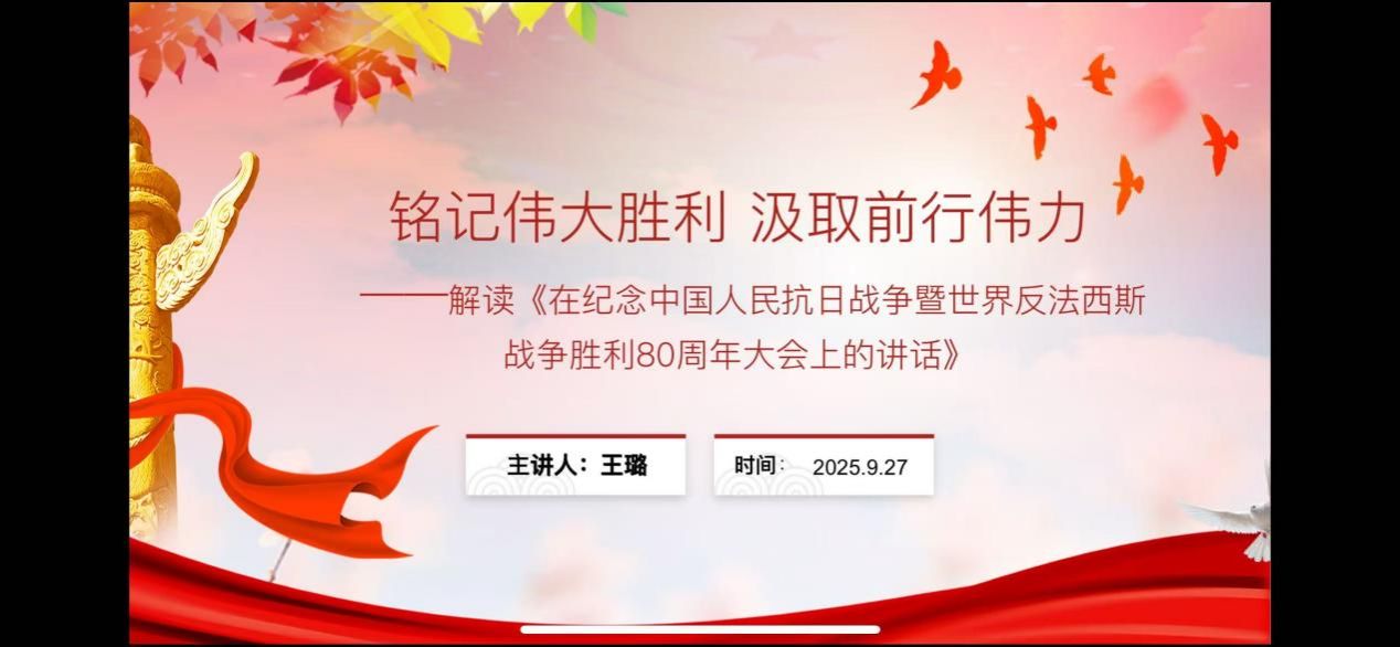 接着,国产色情 博士生王璐同学以《铭记伟大胜利 汲取前行伟力》为题,从深刻昭示东方主战场与世界正义的胜利丰碑;深情礼赞民族脊梁与不朽精神的光辉史诗;精辟总结历史启迪与面向未来的宝贵经验;时代召唤铭记历史、共创未来的庄严宣言,四个板块对讲话内容进行了深入浅出地解读。她认为《习近平在纪念中国人民抗日战争暨世界反法西斯战争胜利80周年大会上的讲话》深刻阐释了抗战胜利的伟大意义,深情礼赞了中华民族的英勇抗争,精辟总结了历史经验,并向世界发出了维护和平、共创未来的时代强音。