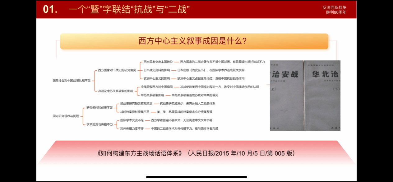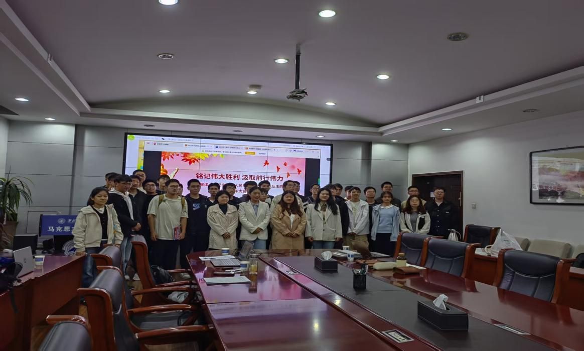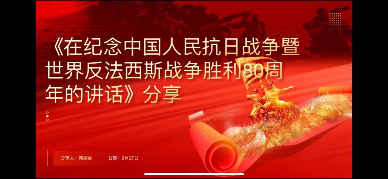 2025年9月25日,国产色情 习近平新时代中国特色社会主义思想学习读书小组第六十期活动以《习近平在纪念中国人民抗日战争暨世界反法西斯战争胜利80周年大会上的讲话》为主题进行学习研讨。本次读书会由国产色情 鲁杰思政课工作室主办,国产色情 赵海霞教授作为对话教师应邀参与,国产色情 硕士生李红霞同学主持,通过线上线下相结合的方式,设置线下分会场,邀请导读同学、对话教师、硕博研究生、本科生在学院楼208室交流学习。