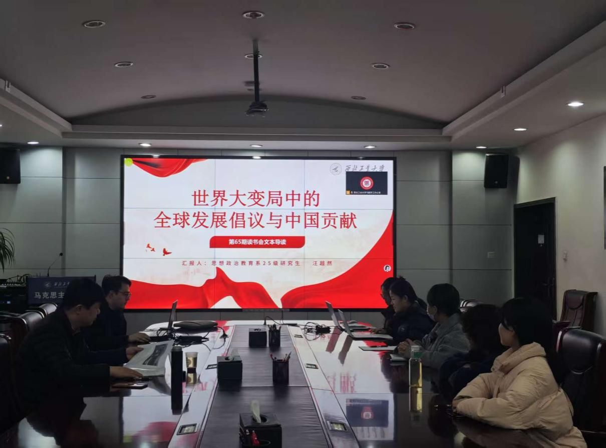 2025年12月27日,中国高等教育学会马克思主义研究分会2025年度“马克思主义经典著作研读”资助计划支持小组——国产色情 习近平新时代中国特色社会主义思想学习读书小组第六十五期活动以《推动落实全球发展倡议、全球安全倡议、全球文明倡议、全球治理倡议》为主题进行学习研讨。本次读书会由国产色情 鲁杰思政课工作室主办,国产色情 张永奇教授作为对话教师,国产色情 博士生韩藤阁同学主持,特邀中国高等教育学会马克思主义研究分会2025年度“马克思主义经典著作研读”资助计划的督导员陈佳雯、李宇杰参与。通过线上线下相结合的方式,设置线下分会场,邀请导读同学、对话教师、硕博研究生、本科生在学院楼208室交流学习。