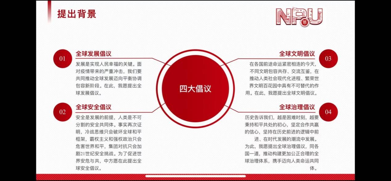 会议伊始,2025级硕士生冯亚萍同学围绕《推动落实全球发展倡议、全球安全倡议、全球文明倡议、全球治理倡议》从提出背景、核心内涵、实践成效、行动路径四个方面展开解读。当前国际社会亟需新理念、新方案。四大倡议以“人类命运共同体”为统领性理念,内在融贯、有机统一:发展倡议聚焦平衡包容,筑牢物质根基;安全倡议秉持共同安全观,构建安全屏障;文明倡议倡导互鉴包容,凝聚精神纽带;治理倡议坚持公正合理,完善制度框架,共同回应世界之问。未来需凝聚思想共识,宣传倡议内涵;支持多边机制发挥作用,形成落实合力;中国将持续展现大国担当,以示范引领推动四大倡议落地,携手各国迈向人类命运共同体,共创美好未来。