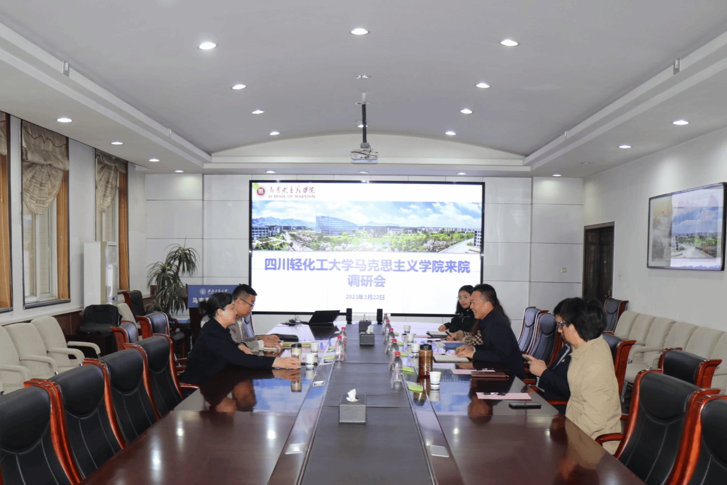 王建琼对学院的热情接待表示由衷感谢。会上,双方共同观看了《四川轻化工大学宣传片》,她详细介绍了四川轻化工大学校史校情、学科建设及学院设置、多校区办学经验及“研学结合、产教融合、特色发展”的发展战略等情况,她表示,此次来访希望能学习学院学科建设和思政课教学改革经验,招聘学院马克思主义理论博士研究生。