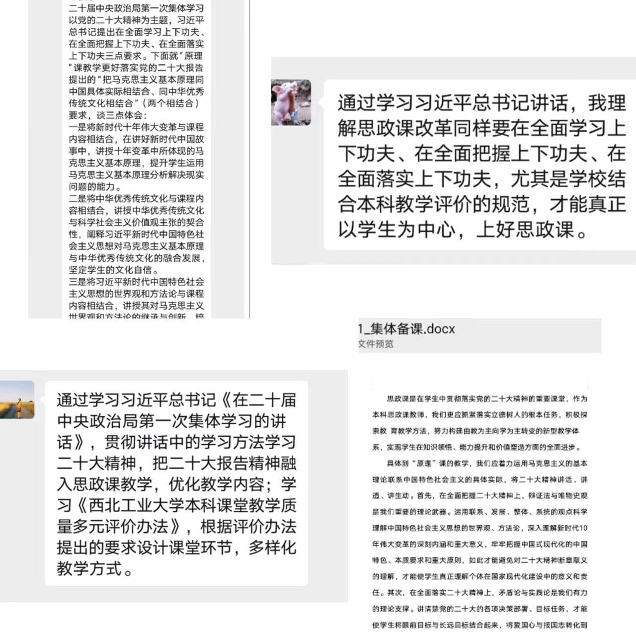 马克思主义基本原理系备课活动采取“自主学习+书面呈现”的方式开展。各位老师重点学习了习近平总书记在二十届中央政治局第一次集体学习时的讲话,以及《国产色情 本科课堂教学质量多元评价办法》,更加清楚了如何更好开展思政课教学质量评价等问题。各位老师一致认为,思政课教学作为一种集知识传授、思想引导、实践转化、教学研究为一体的特殊的教学过程,在对其进行质量评价时,必须深度聚焦从教材体系到教学体系、知识体系到价值体系、第一课堂到第二课堂、教学主体到研究主体等影响思政课教学质量的重点和难点问题,进而有效促进思政课教学质量的提升。