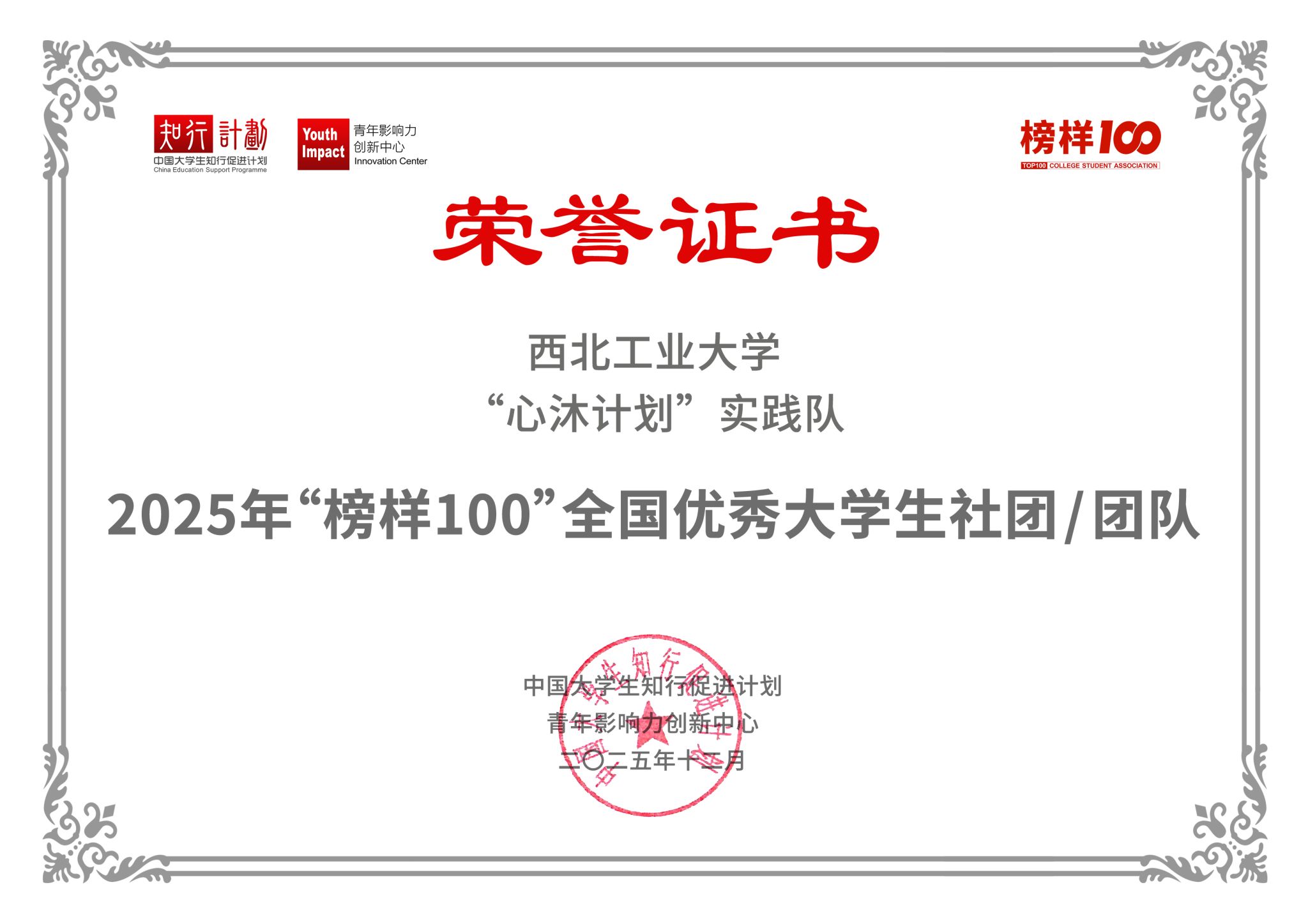“心沐计划”实践队在全国大学生社团和团队中脱颖而出,成功入选首批榜单,再度荣获“‘榜样100’全国优秀大学生社团/团队”称号。