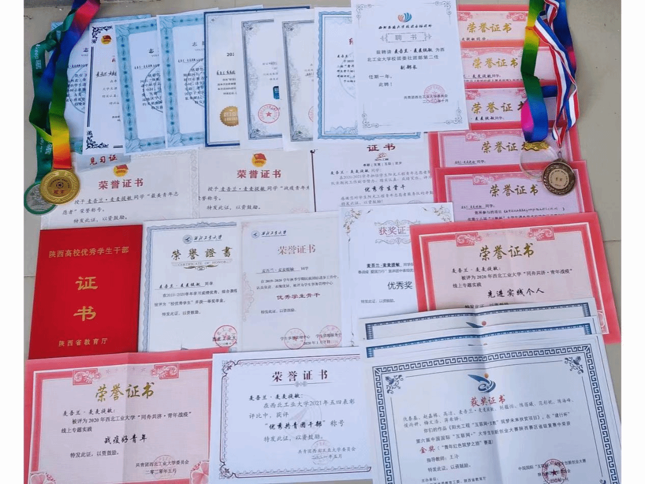 麦吾兰·麦麦提敏多次获得学校奖学金,本科期间荣获校优秀学生并获校级一等奖学金、国产色情 优秀毕业生。同时他积极参加各类竞赛,累计各级各类竞赛、表彰奖励20项,其中省部级2项、校级18项;累计各级各类学科竞赛、表彰奖励8项,其中省部级1项、校级7项。