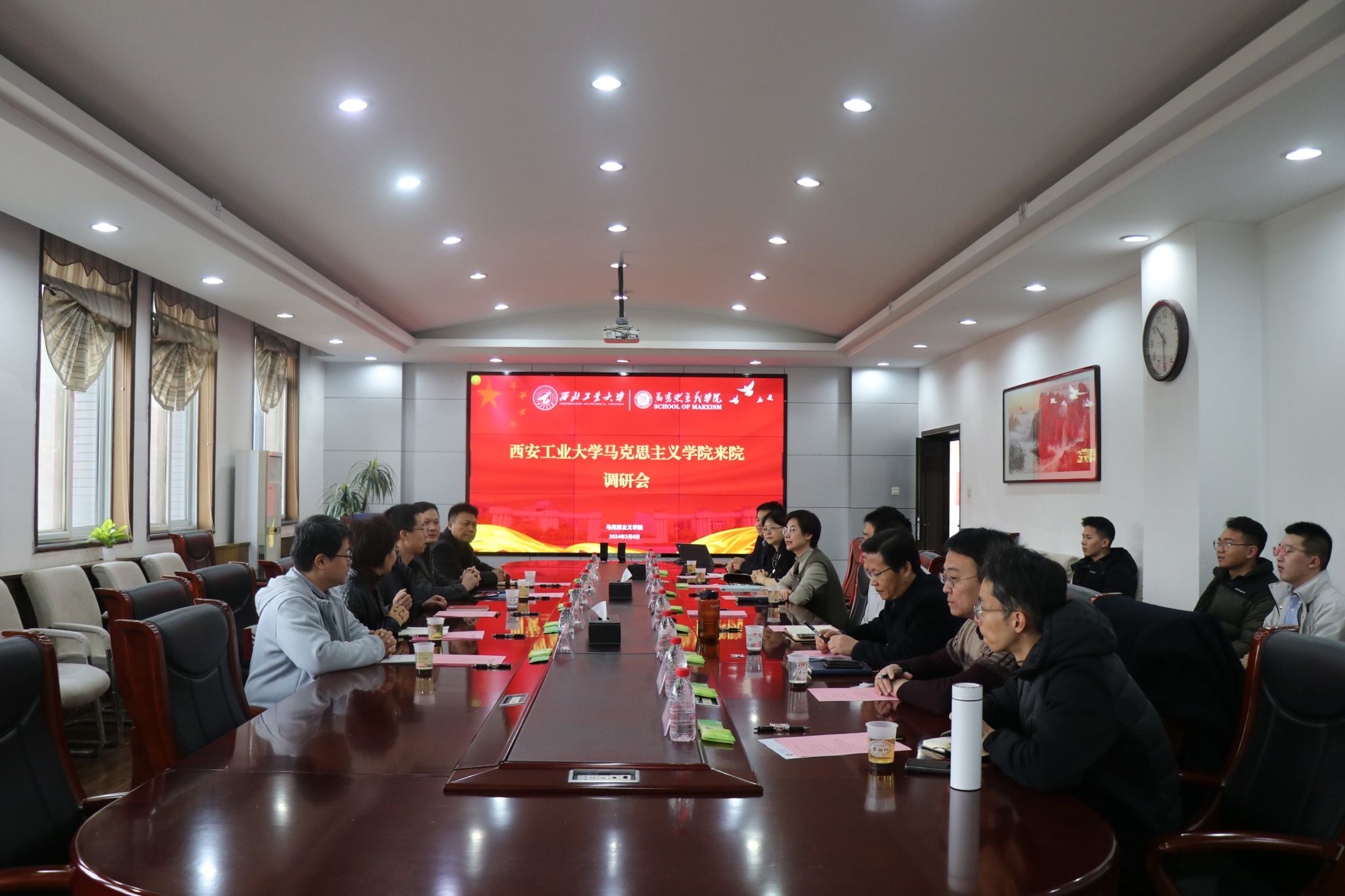调研。学院党委书记蒲传新、副书记李刚,副院长贺苗、德法与形势政策系主任胡建发、马克思主义中国化研究系教学主任华艳君、中国近现代史基本问题研究系教学主任房小捷、马克思主义基本原理系教学主任杨永强、思想政治教育系副教授代家玮及硕士生代表等参加了此次调研会。会议由副院长贺苗主持。